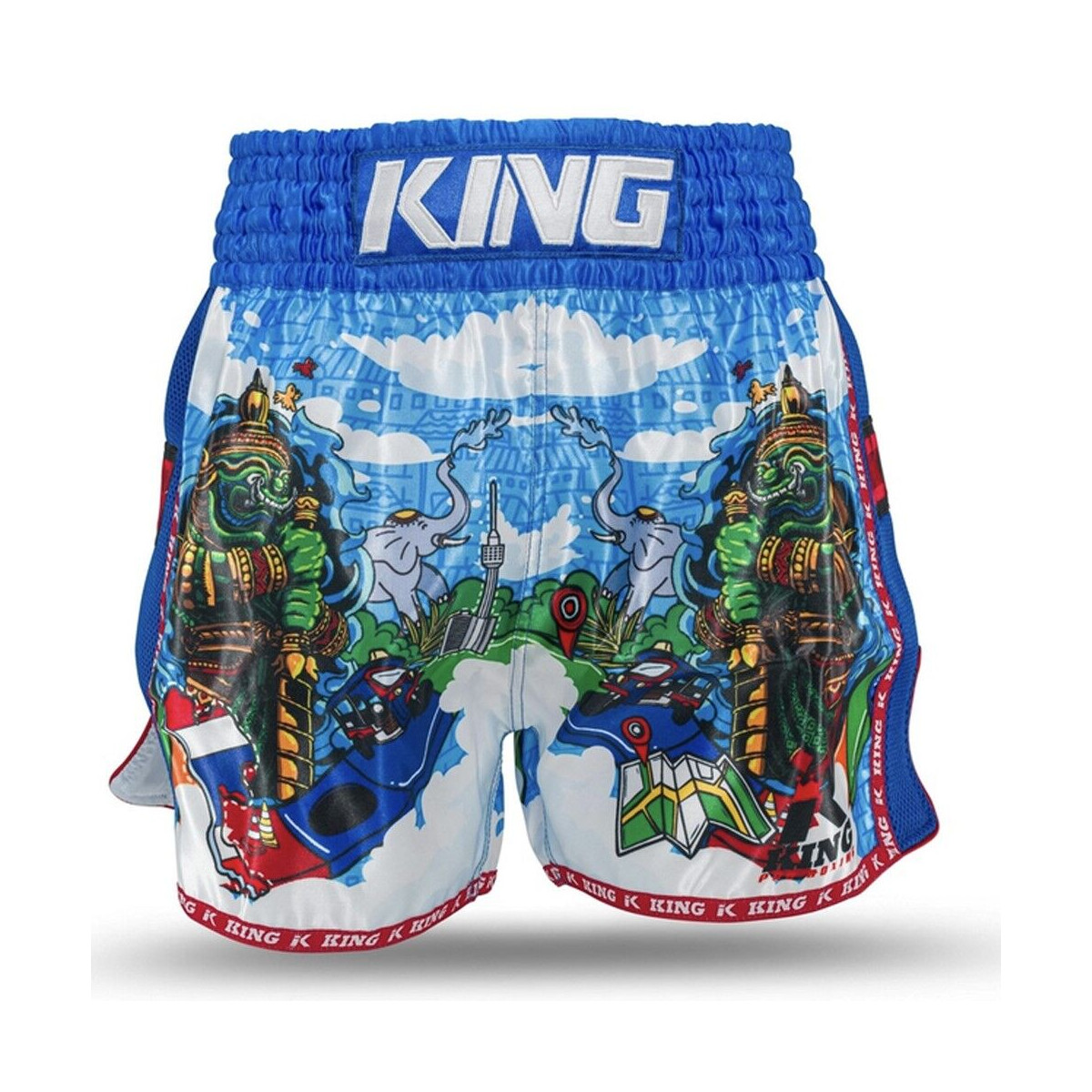 Découvrez le short Muay Thai KPB Thailand de King Pro Boxing, une fusion vibrante entre l'héritage culturel thaïlandais et l'artisanat d'exception. Ce short arbore un design entièrement sublimé mettant en scène les attraits emblématiques de la Thaïlande : le légendaire Hanuman, les traditionnels tuktuks et la délicieuse cuisine thaïe, créant une véritable tapisserie immersive de l'imagerie iconique du pays.